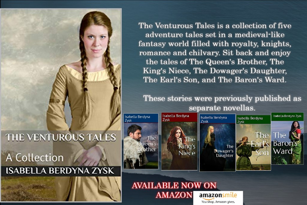 The Venturous Tales is a collection of five adventure tales set in a medieval-like fantasy world. The stories were previously published as separate novellas titled The Queen’s Brother, The King’s Niece, The Dowager’s Daughter, The Earl’s Son, and The Baron’s Ward.